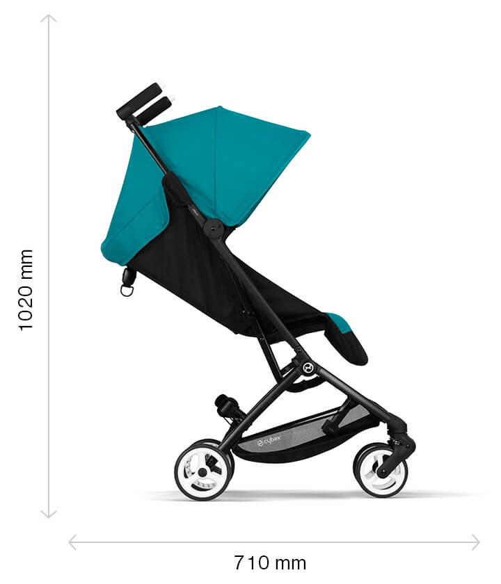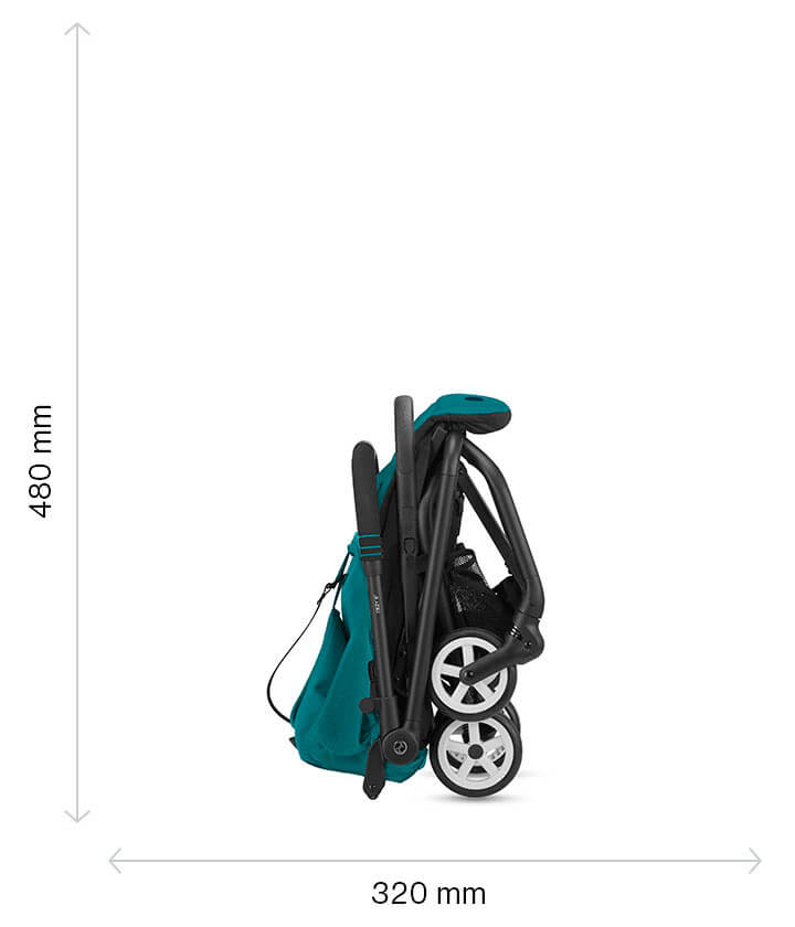 The Libelle compact stroller can be folded in seconds into a compact package measuring only L 32 cm x W 20 cm x H 48 cm. This makes it our most compact stroller when folded. The compact folded size makes the Libelle ideal for travel, as it is hand luggage compliant in 99% of airlines. Each airline has their own rules regarding carry-on and check-in luggage, so please check with your airline before taking this stroller onboard a plane.